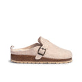 Zapatillas sencillas y elegantes en color beig con hebilla decorativa.
