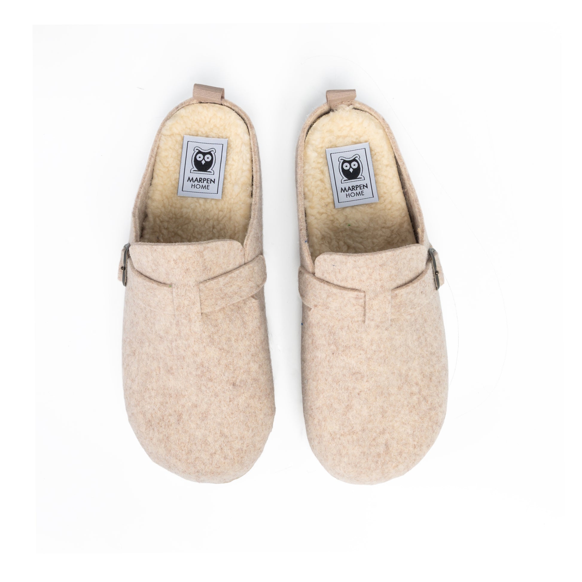 Realizadas en fieltro reciclado, un tejido que ayuda a mantener los pies cálidos con suavidad y comodidad. Este material reciclado contribuye a la sostenibilidad del planeta con un importante ahorro de agua, emisiones de CO2 y energía.