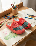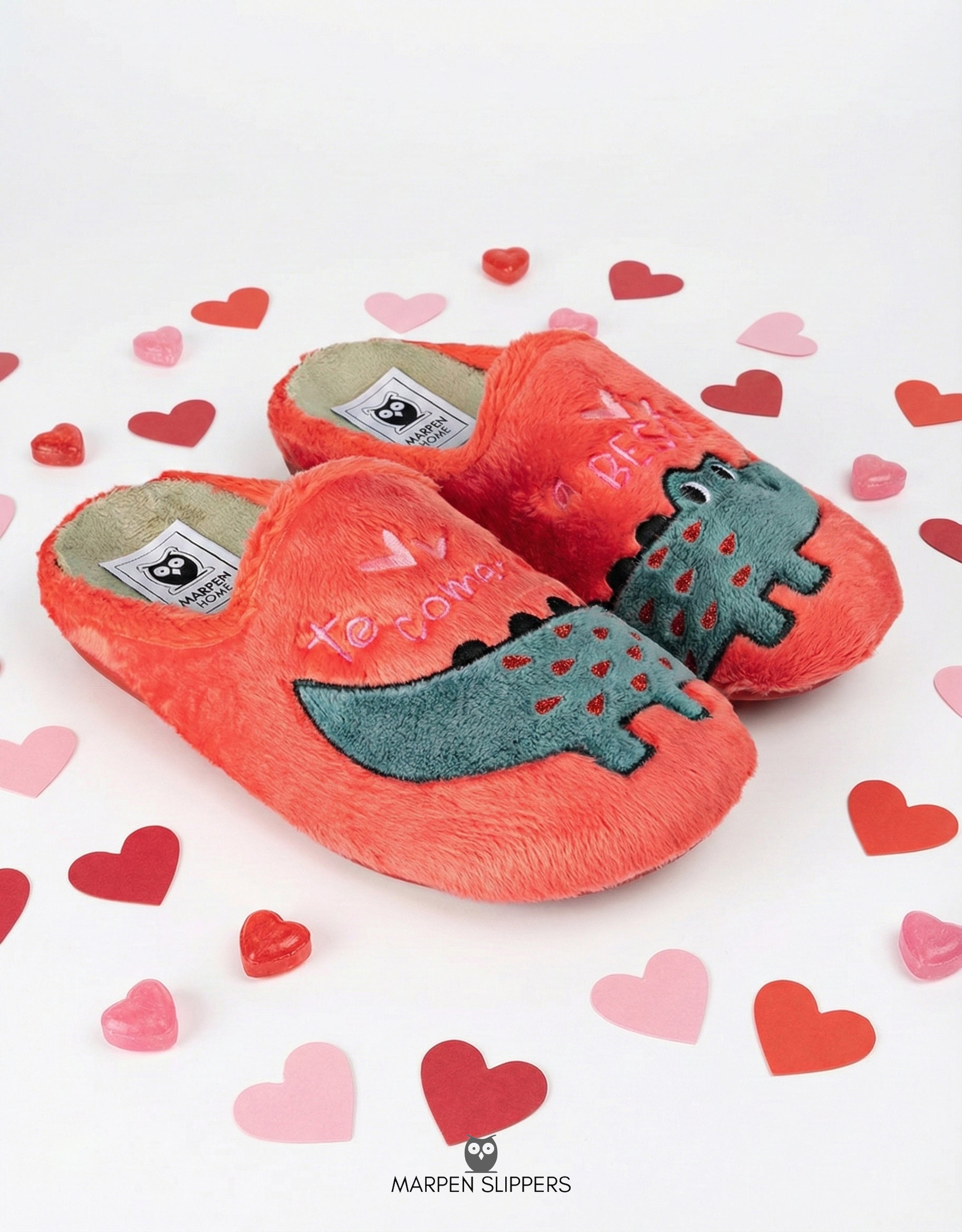 Zapatillas de andar por casa en color fresa con divertido diseño de dinosaurio y el mensaje “¡Te comería a besos!”. Una explosión de ternura y buen humor para tus pies.