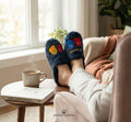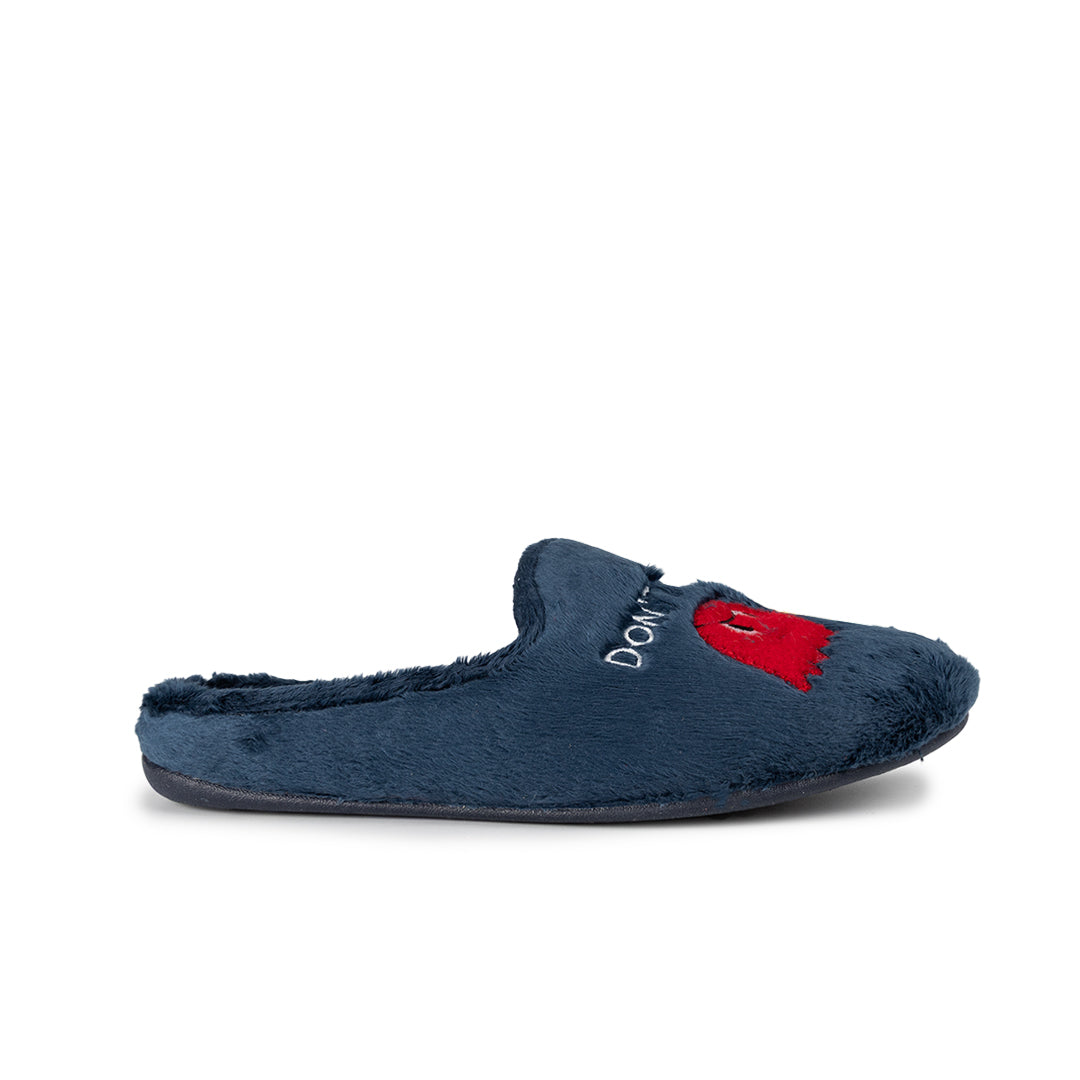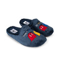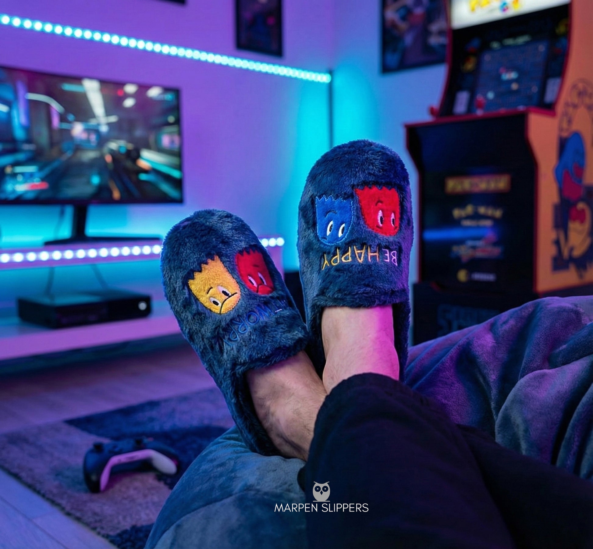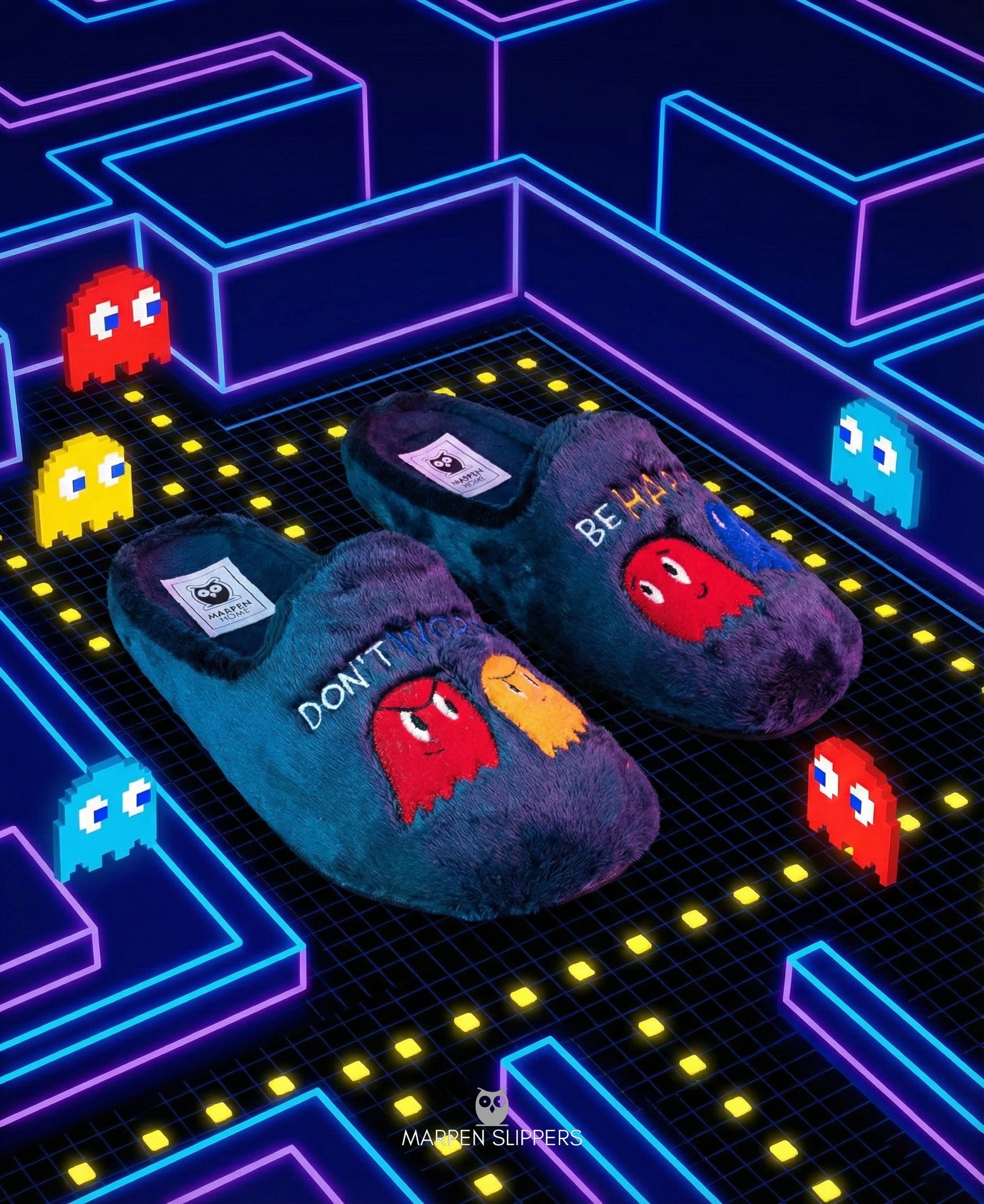Zapatillas de andar por casa en azul marino con diseño retro inspirado en los clásicos videojuegos, acompañadas del mensaje “Don’t worry, be happy”. Diversión y nostalgia en cada paso.