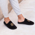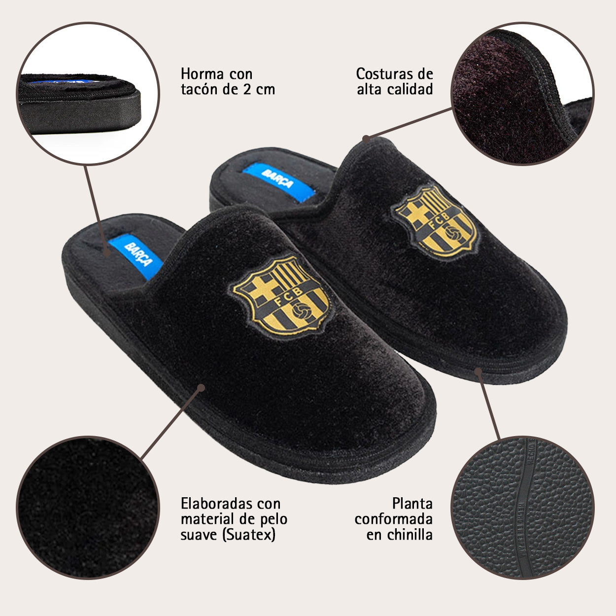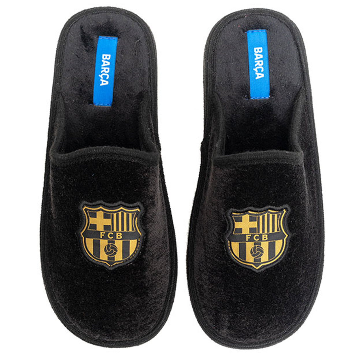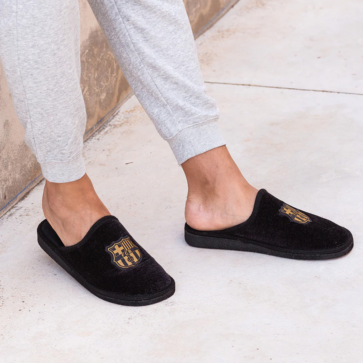 Zapatillas FC Barcelona para estar por casa con diseño liso en color negro para toda la familia, hombre, mujer y niño. Tejido suave y escudo grande estampado en la pala. Ideales para los más forofos.