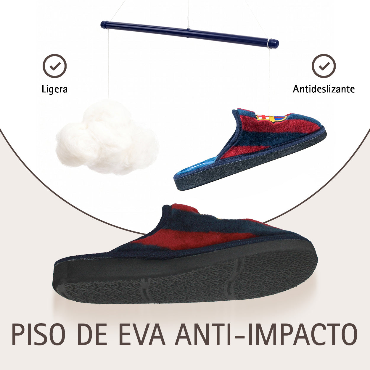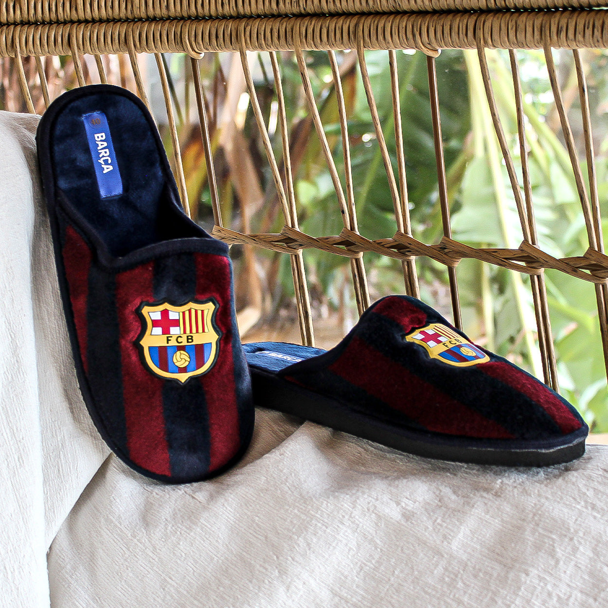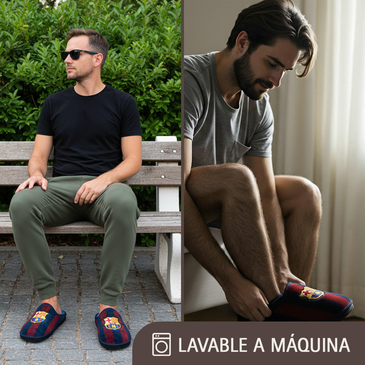 Zapatillas para ir por casa para hombre, mujer y niño, con diseño bicolor. Sus dos colores combinan a la perfección y hacen de esta zapatilla todo un diseño clásico y alegre. Tejido suave y escudo grande estampado en la pala. Ideales para los más forofos.