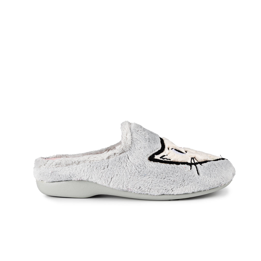 Zapatillas de andar por casa en color gris suave con un adorable diseño gatuno y la frase bordada “Oh my cat!” que encantará a los amantes felinos.