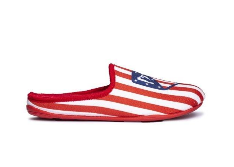 Zapatillas con diseño de rayas y escudo grande en la pala del Atlético de Madrid para toda la familia hombre, mujer y niño. De tejido cálido y colores corporativos.