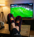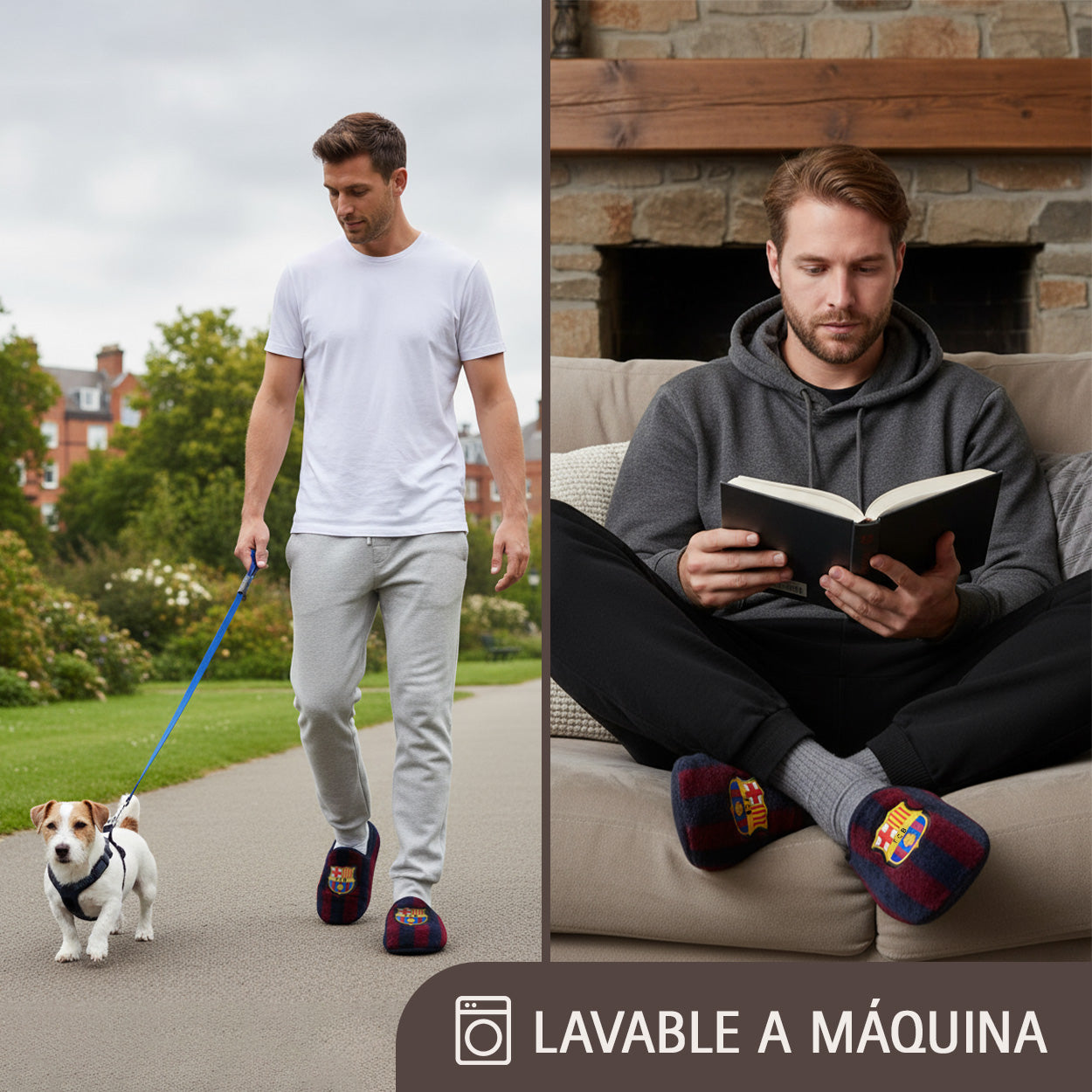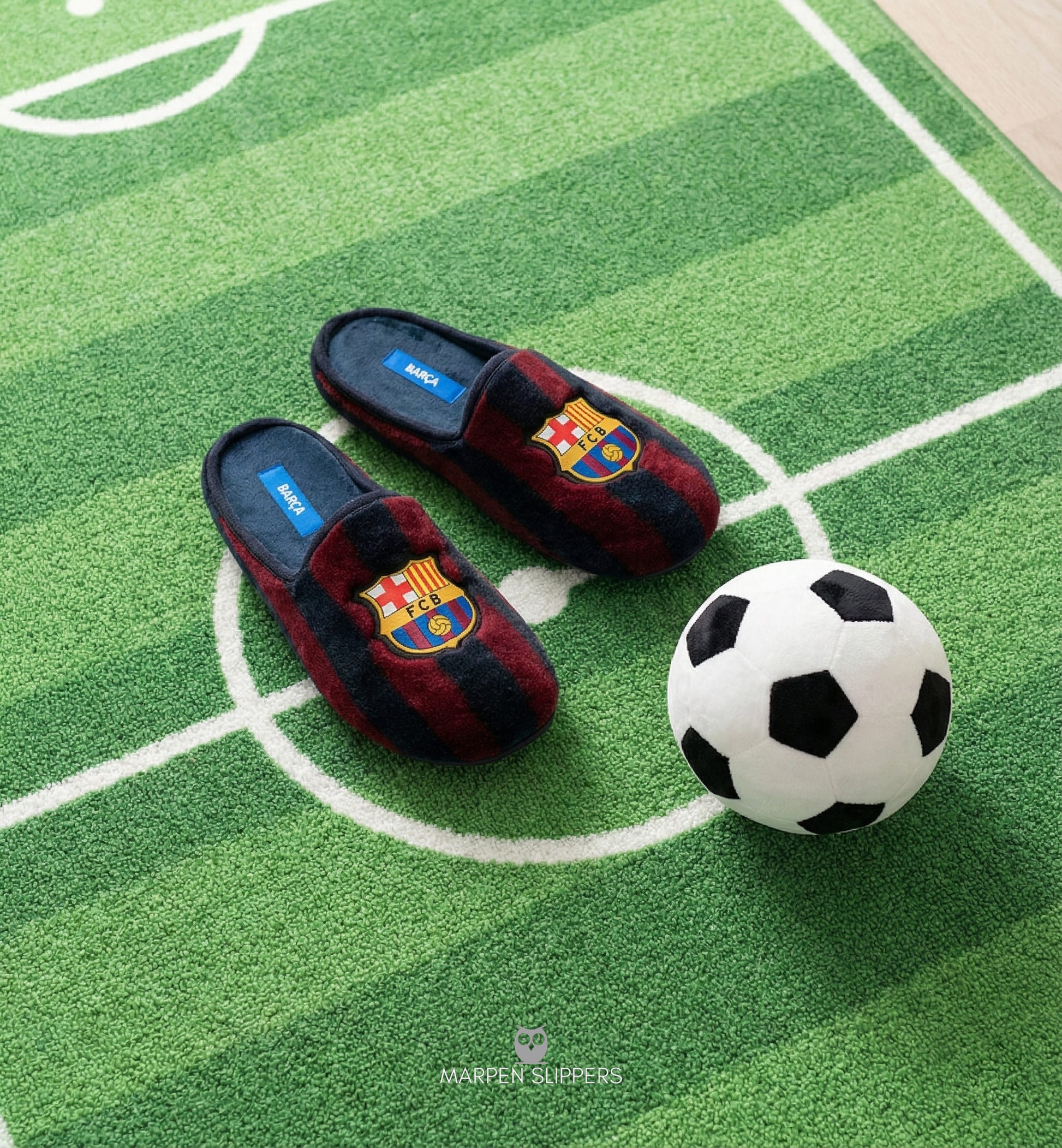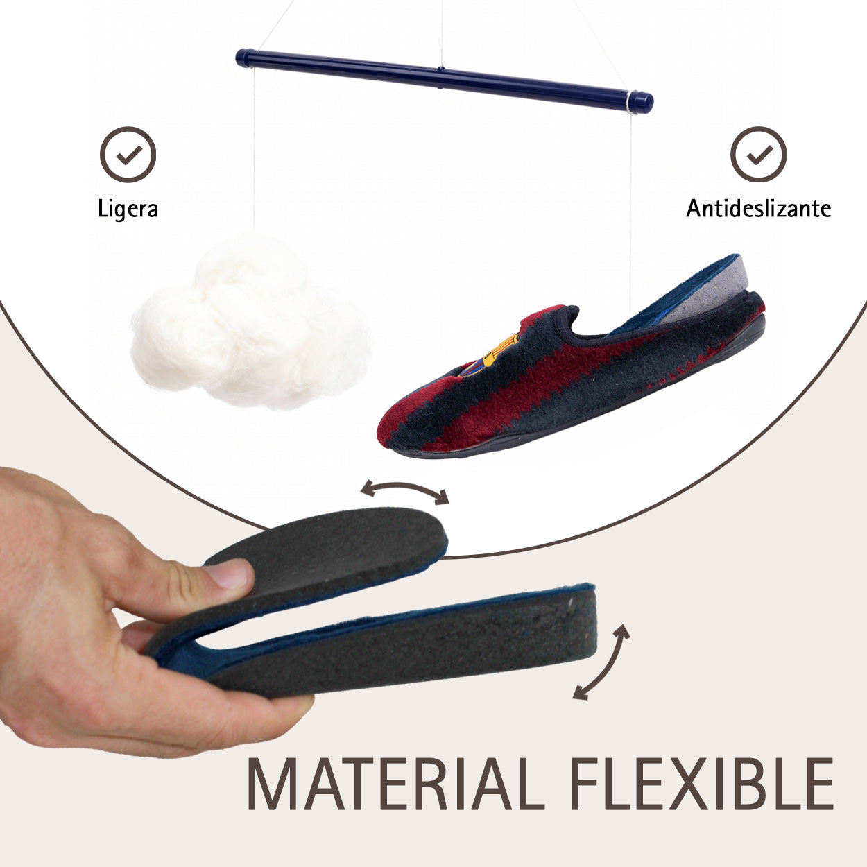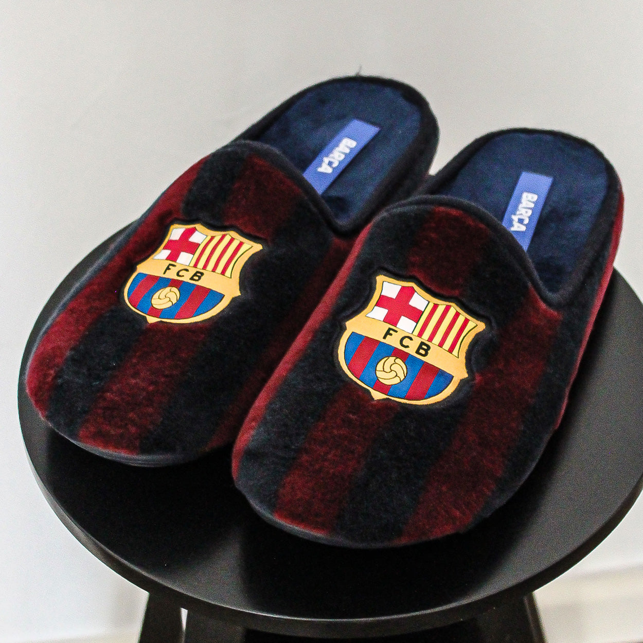 Zapatillas de casa Barcelona Clásicas para toda la familia, hombre, mujer y niño. Sus características rayas de temporadas pasadas se trasladan a nuestras zapatillas de tejido suave, colores emblemáticos y escudo en grande estampado en la pala. Ideales para los más nostálgicos.